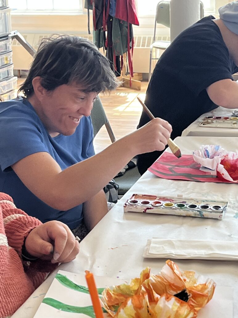 An Art Lab participant creates a flower painting, where creativity and belonging flourish.